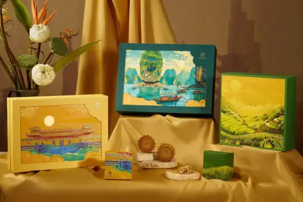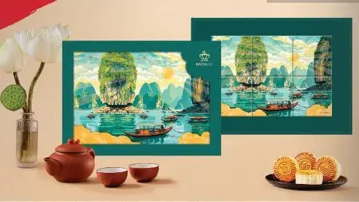 Bánh Trung Thu cao cấp “Non Sông Việt Nam” mô phỏng vẻ đẹp Việt Nam – đất nước của những dòng sông, dòng văn hóa thi ca sâu lắng. Trải dọc đất nước bao la, vùng đất nào cũng lưu giữ một huyền thoại về dòng sông chảy trên mảnh đất ấy. Những dòng sông mang màu xứ sở, mang hồn đất nước. Bức tranh sông cong theo dáng chữ S thân thương, đẹp và sống động hơn tất thảy tạo vật trên đời. Theo dòng chảy của nước, ta còn thấy dòng chảy của kinh tế, giao thương, buôn bán và những nét đẹp lao động đời thường của người dân.