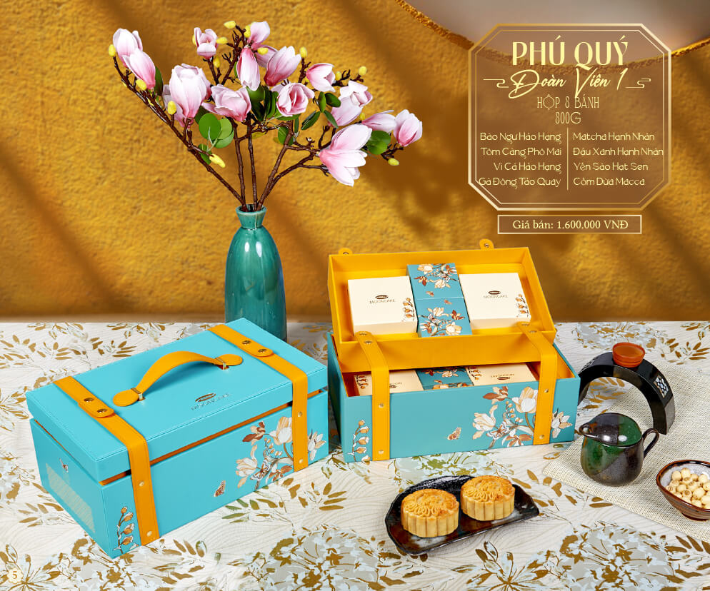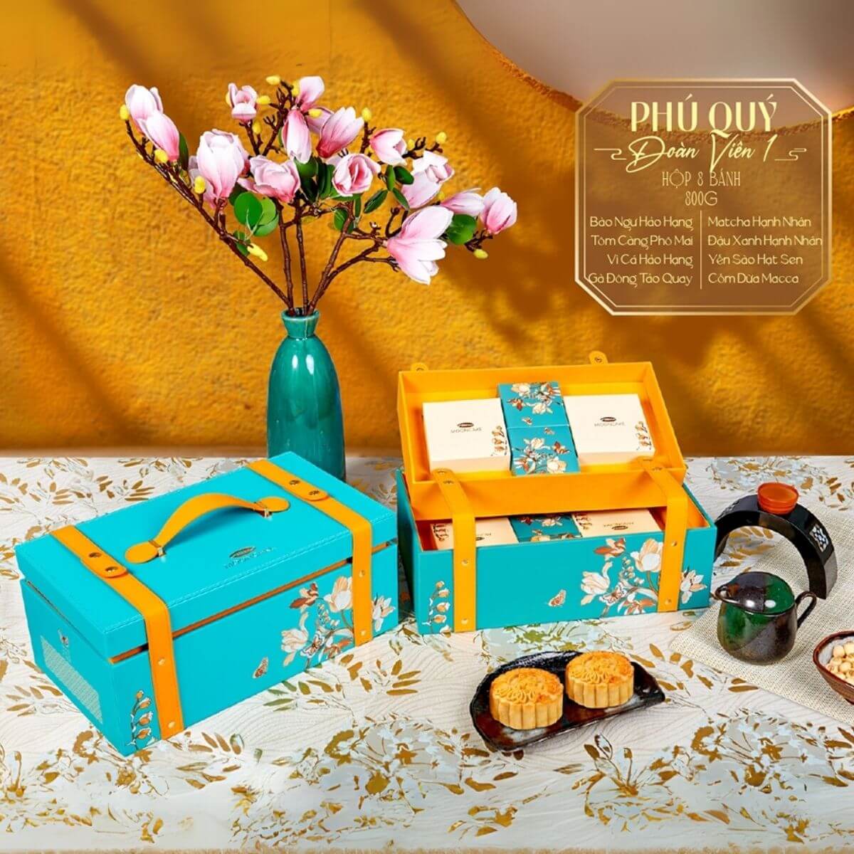 Phú Quý Đoàn Viên 1 nổi bật với hộp quà mang tông màu xanh ngọc tươi sáng kết hợp vàng nghệ sang trọng, đi kèm họa tiết hoa mộc lan tinh khôi – biểu tượng của sự đoàn viên, thanh tao và bền chặt.
