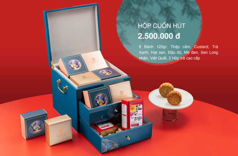 Hộp 8 bánh nướng 120gr: Gồm nhân Thập Cẩm, nhân Custard, nhân Mơ tây, nhân Nam Việt Quất, nhân Hạt Sen Trứng Muối, nhân Sen Hạt Dẻ, nhân Mè Đen Óc Chó, nhân Sen Trà Xanh & Trà Phổ nhĩ sống cổ thụ Hoàng Su Phì 48g .