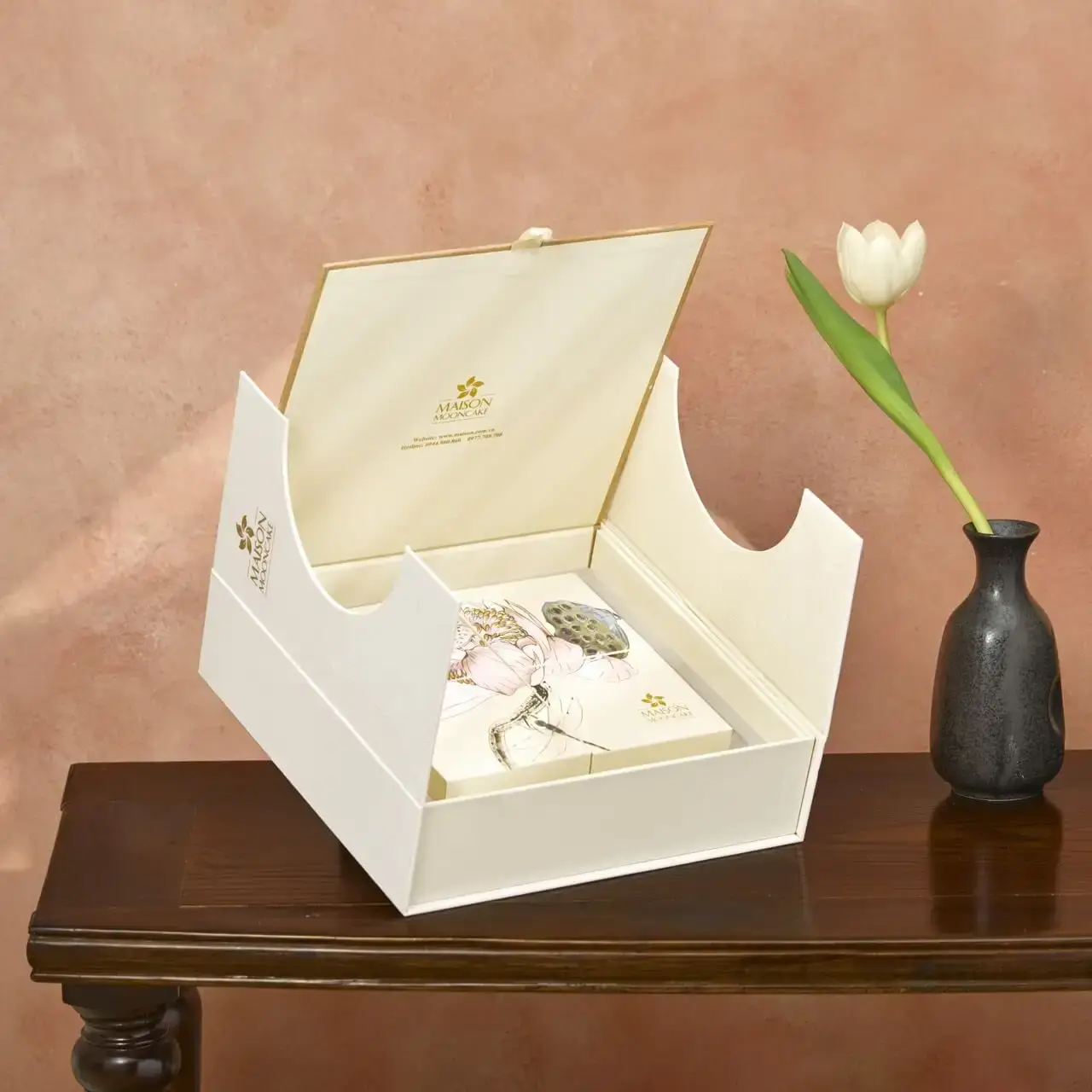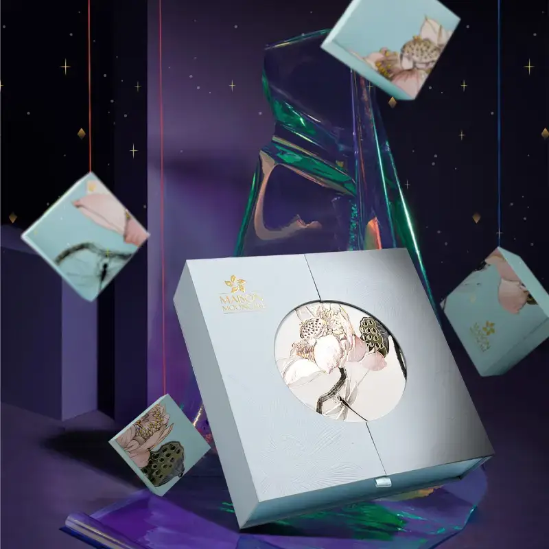 Hộp 4 bánh nướng 80gr: Gồm nhân Thập Cẩm, nhân Sen Trà Xanh, nhân Hạt Sen Trứng Muối, nhân Mè đen Óc chó.