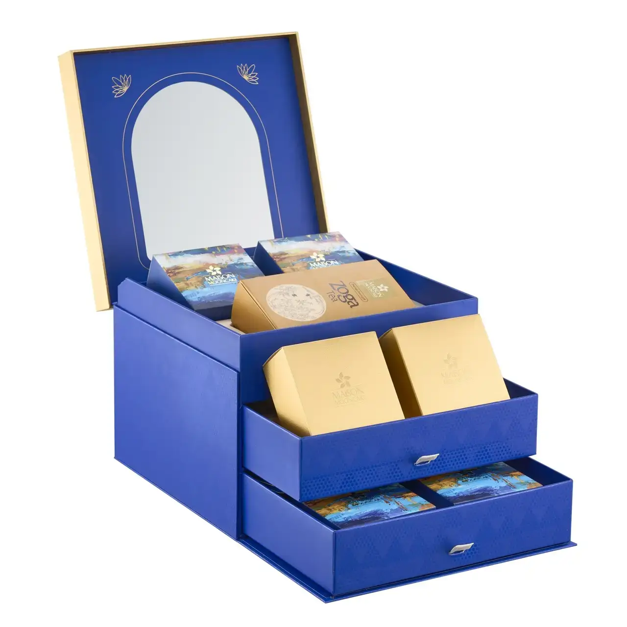 Hộp 10 bánh nướng 80gr: Gồm nhân Thập Cẩm, nhân Custard, nhân Sen Trà Xanh, nhân Mơ Tây, nhân Hạt sen Long nhãn trứng muối, nhân Đậu đỏ, nhân Nam Việt Quất, nhân Hạt Sen Trứng Muối, nhân Mè Đen Óc Chó, nhân Sen Hạt dẻ & Trà Zoga Thảo Mộc – 40g.